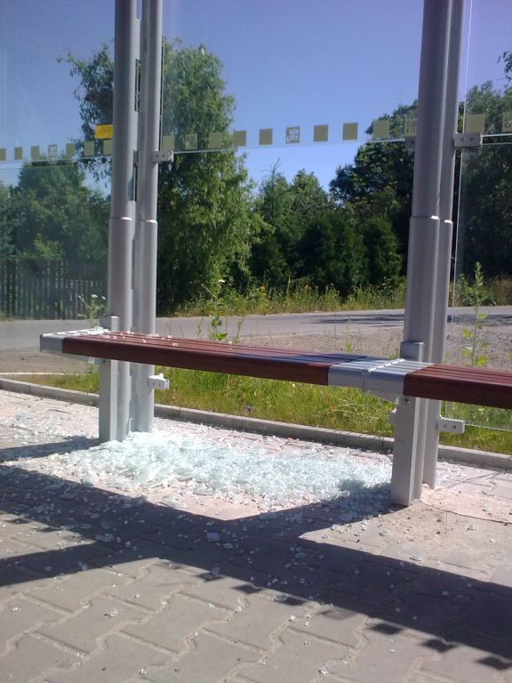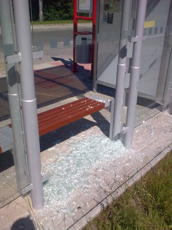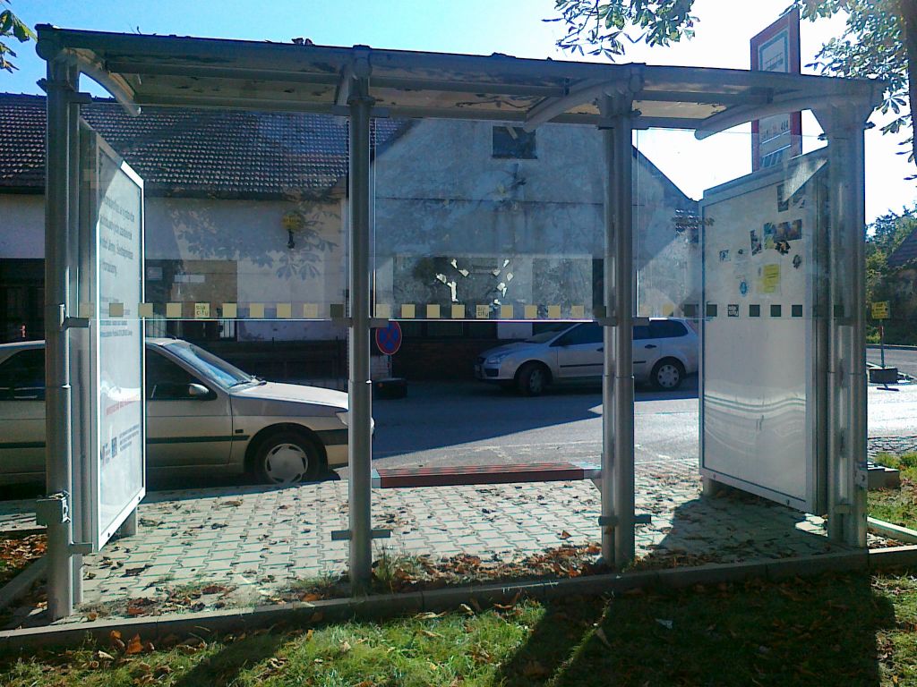 červen 2011 - lavička v zastávce Horoušánky po zásahu - omluva - idiota s nožem